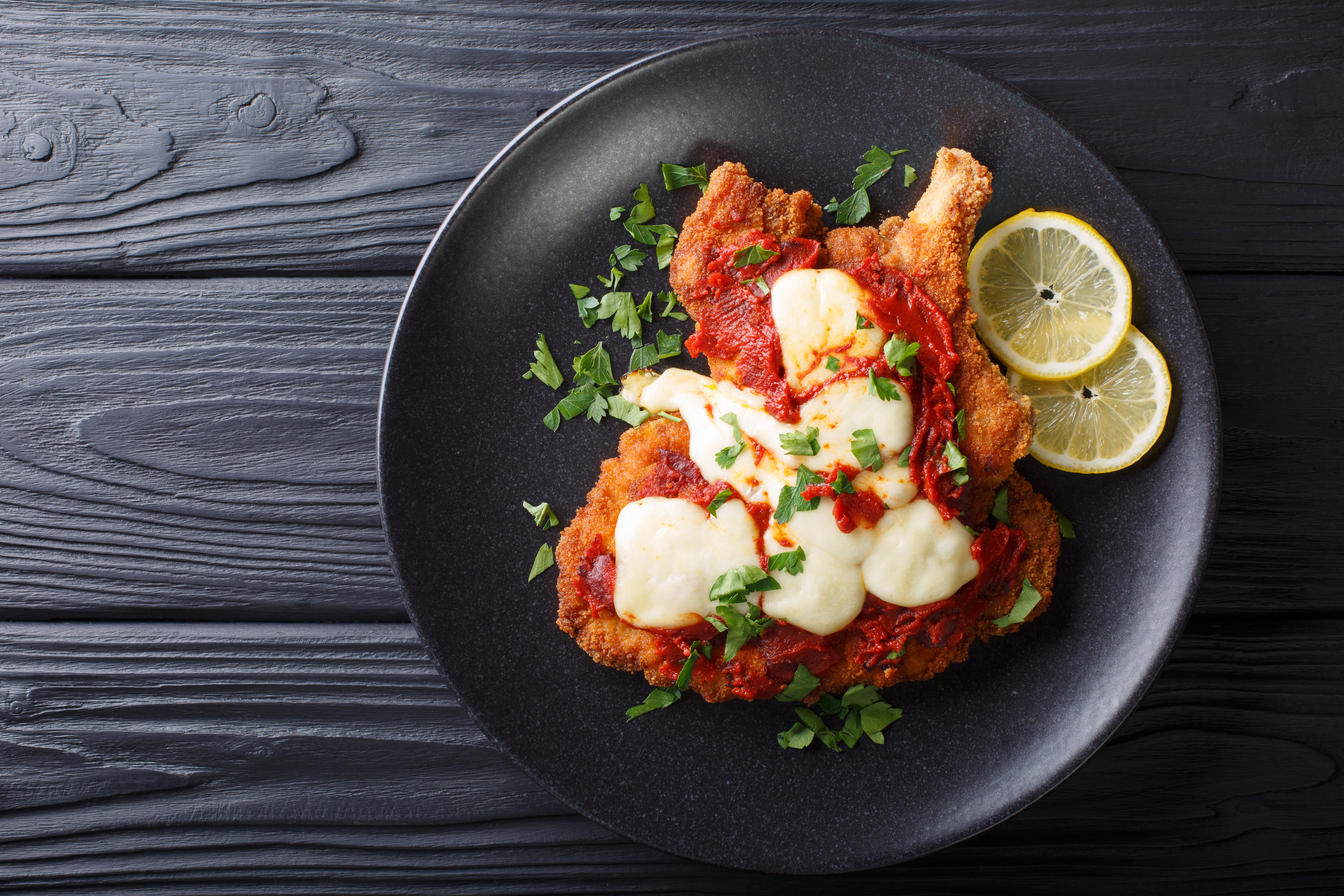 Breaded veal or chicken, pan-fried to golden, topped with melted cheese and house sauce, served with a side of your choice.